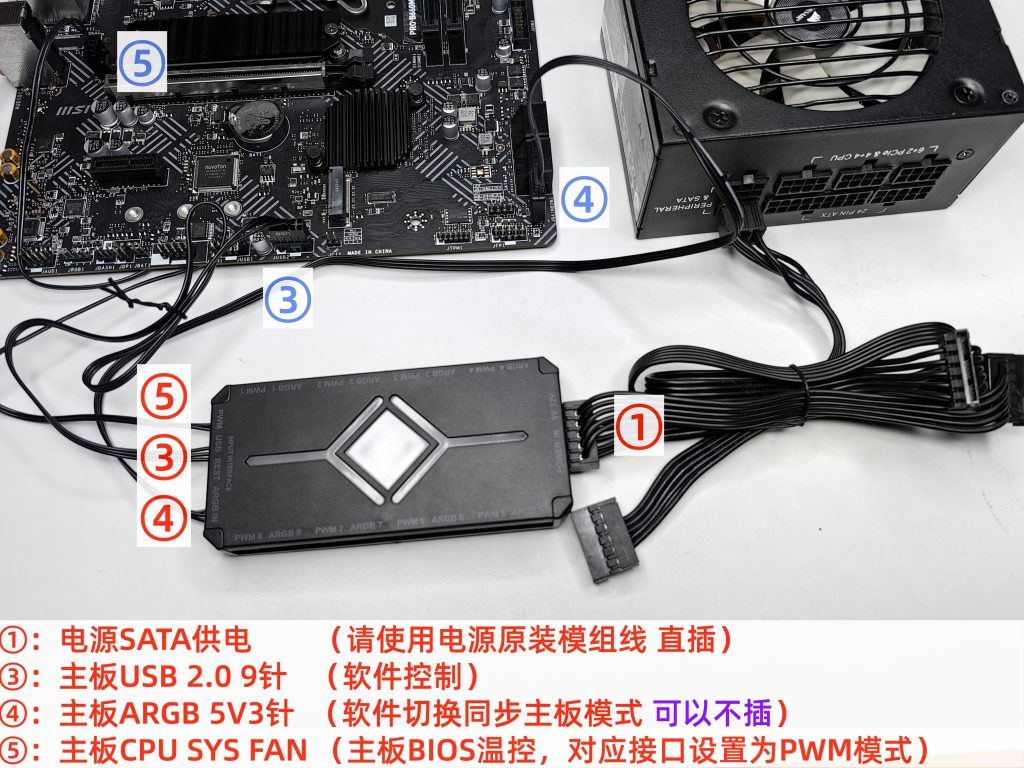 ④同步线: 插主板5V3针ARGB(同步主板模式。异步不需要可以不插)