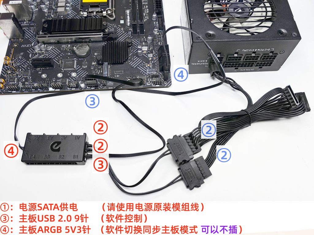 ④同步线: 插主板5V3针ARGB(同步主板模式。异步不需要可以不插)
