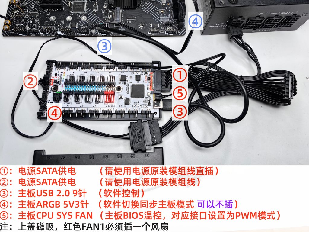 ④同步线: 插主板5V3针ARGB(同步主板模式。异步不需要可以不插)