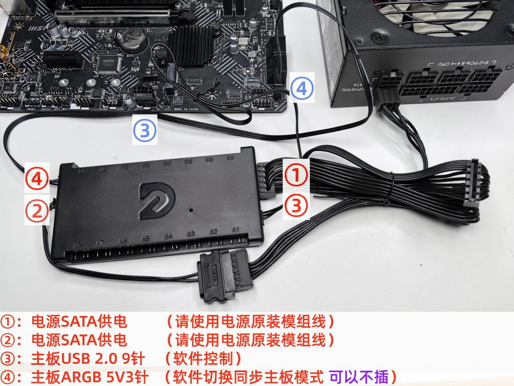 ④同步线: 插主板5V3针ARGB(同步主板模式。异步不需要可以不插)
